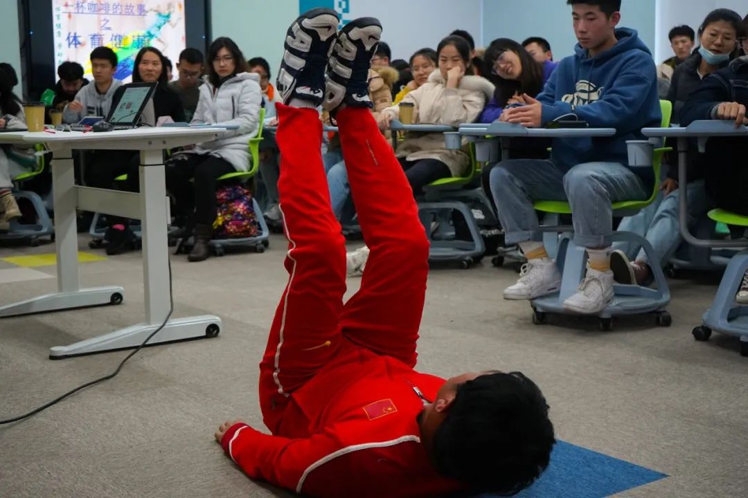 着眼当下大学生,杜老师提出,对同学们来说,科学运动很难坚持的主要原因是不够自律,若同学们能用心坚持,总能有所收获。杜老师建议同学们不要把运动局限在体育馆和健身房内,运动场、宿舍和教室随时可以找到简单的锻炼方法。针对科学的身体锻炼,杜老师给出了建议:训练之前首先需要对自身进行正确评估,其次要明确自己的目标。只有根据自己的身体状况和期望目标做出合理的安排,锻炼计划才更有执行力。杜老师鼓励大家,运动虽然不是万能的,却也能改变很多,健康的体魄往往来源于运动,而非医药。最后,杜老师与同学们开展了问答互动,杜老师还亲身示范如何科学锻炼。