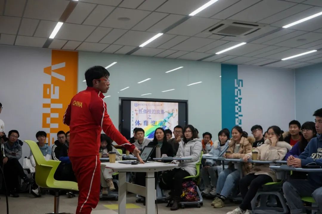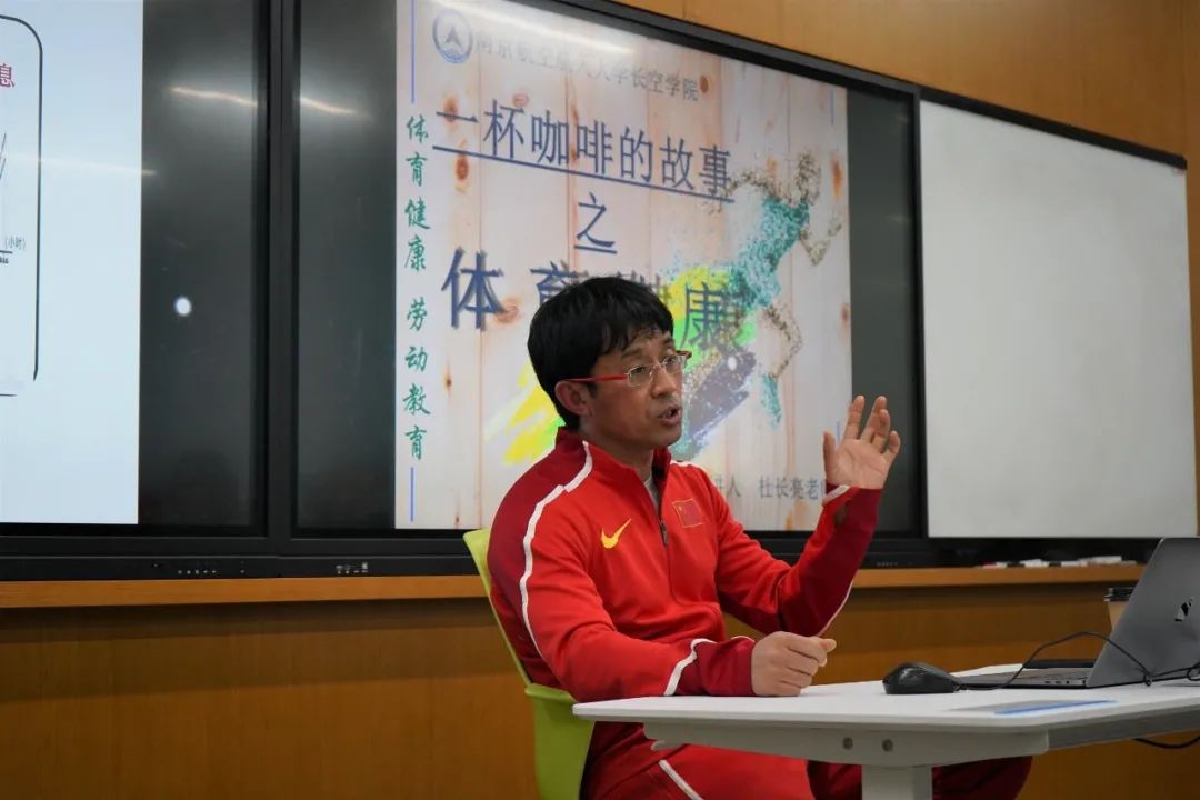 12月10日中午,我校体育部副主任、体育教育训练学博士杜长亮教授作客太阳成集团tyc151cc“一杯咖啡的故事”,与长空学子围绕“大学生运动与健康”进行了一次愉快的交流,杜老师幽默的话语引得在场学生捧腹,强健帅气的身姿也令同学们羡慕不已。杜老师从体育思想、体育文化及科学锻炼三个方面与同学们分享了自己的观点。